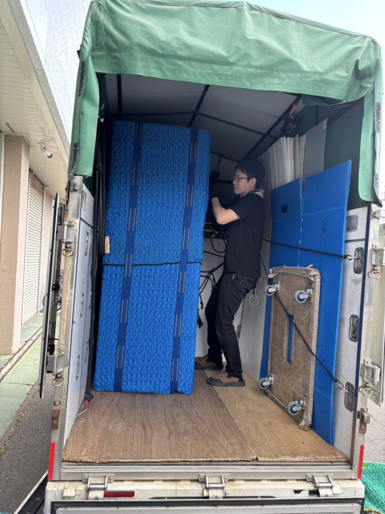 荷台の中でも倒れる危険性がある為、ベルトなどを使って荷台内でしっかり固定しています。
